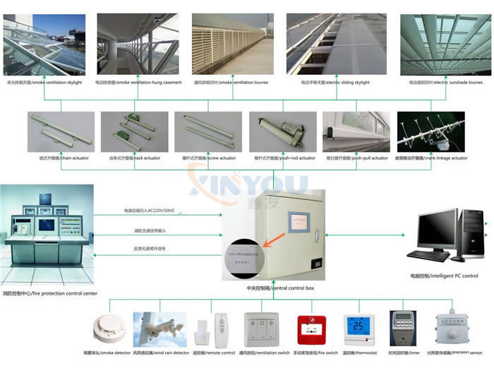 SHEVS is composedof the central control box, fire switch, smoke detector, ventilation switch, remotecontrol, wind rain detector and actuators. SHEVS has the function of Natural VentilationSystems. In addition, when the fire occurs, actuators  are triggered through automatic or manual alarmdevice, SHEVS ensure windows are opened for exhausting smoke. Central controlbox is the core of the whole system.